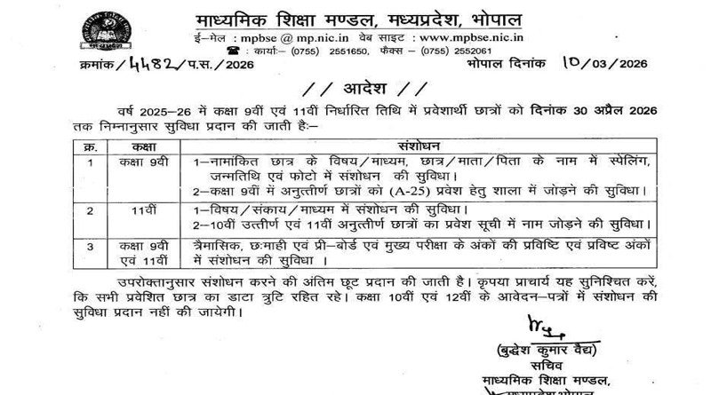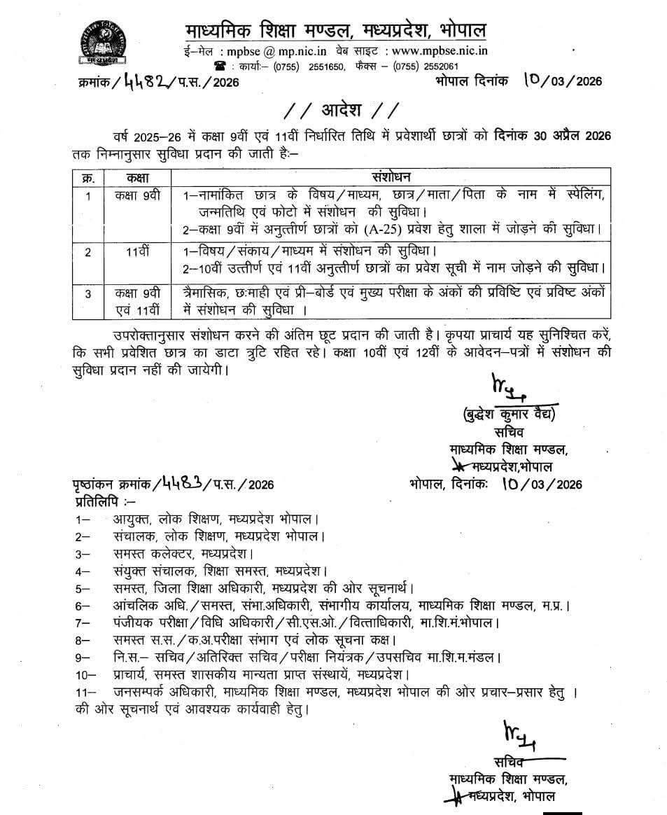 माध्यमिक शिक्षा मण्डल, मध्यप्रदेश, भोपाल द्वारा 9वी और 11वी के छात्रों हेतु महत्वपूर्ण सुचना जारी की है। उन्होंने कहा है की यदि किसी छात्र की अंकसूची में कोई त्रुटि है तो अभी सुधार करा ले। क्योंकि 10वीं और 12वीं में फ़िर सुधार नहीं होता। वर्ष 2025-26 में कक्षा 9वीं एवं 11वीं निर्धारित तिथि में प्रवेशार्थी छात्रों को दिनांक 30 अप्रैल 2026 तक निम्नानुसार सुविधा प्रदान की जा रही है।