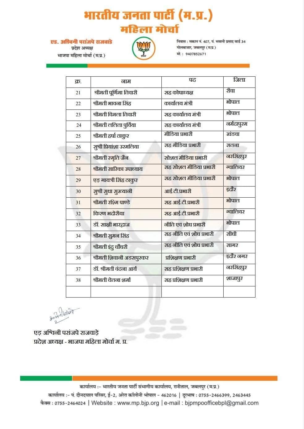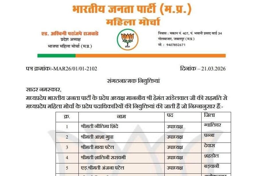 Bhopal भाजपा महिला मोर्चा के प्रदेश पदाधिकारियों की घोषणा scnnewsindia.com March 21, 2026 1 minute readScn News India ब्यूरो रिपोर्टभाजपा प्रदेश अध्यक्ष श्री हेमन्त खंडेलवाल जी की सहमति से भाजपा महिला मोर्चा के प्रदेश पदाधिकारियों की घोषणा की है।Post navigationPrevious: प्रतिष्ठित व्यवसायी दिनेश खुराना का निधन, गंज मोक्षधाम में रविवार को होगा अंतिम संस्कार Related News Bhopal बजरंग दल की शिकायत पर होटल में पुलिस की छापा मार कारवाही,मुस्लिम युवक संग हिन्दू युवती पकड़ाई,हुई कुटाई (वीडियो) scnnewsindia.com March 21, 2026 Bhopal घरेलू गैस और व्यावसायिक गैस सिलेंडरों के अवैध भंडारण और उपयोग और परिवहन पर बड़ी कार्रवाई scnnewsindia.com March 21, 2026 Bhopal सिंहस्थ-2028 में दुनिया देखेगी सनातन संस्कृति का वैभव : मुख्यमंत्री डॉ. यादव scnnewsindia.com March 21, 2026