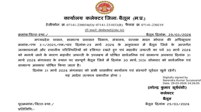 बैतूल 29 मार्च,2026/कलेक्टर श्री नरेन्द्र कुमार सूर्यवंशी ने जनभावनाओं एवं स्थानीय परिस्थितियों के दृष्टिगत महावीर जयंती के उपलक्ष्य में 30 मार्च को जिले में सार्वजनिक एवं सामान्य अवकाश घोषित किया है। पूर्व में घोषित 31 मार्च के स्थान पर अब 30 मार्च को अवकाश रहेगा। 31 मार्च को सभी शासकीय कार्यालय एवं संस्थाएं पूर्ववत खुले रहेंगे।