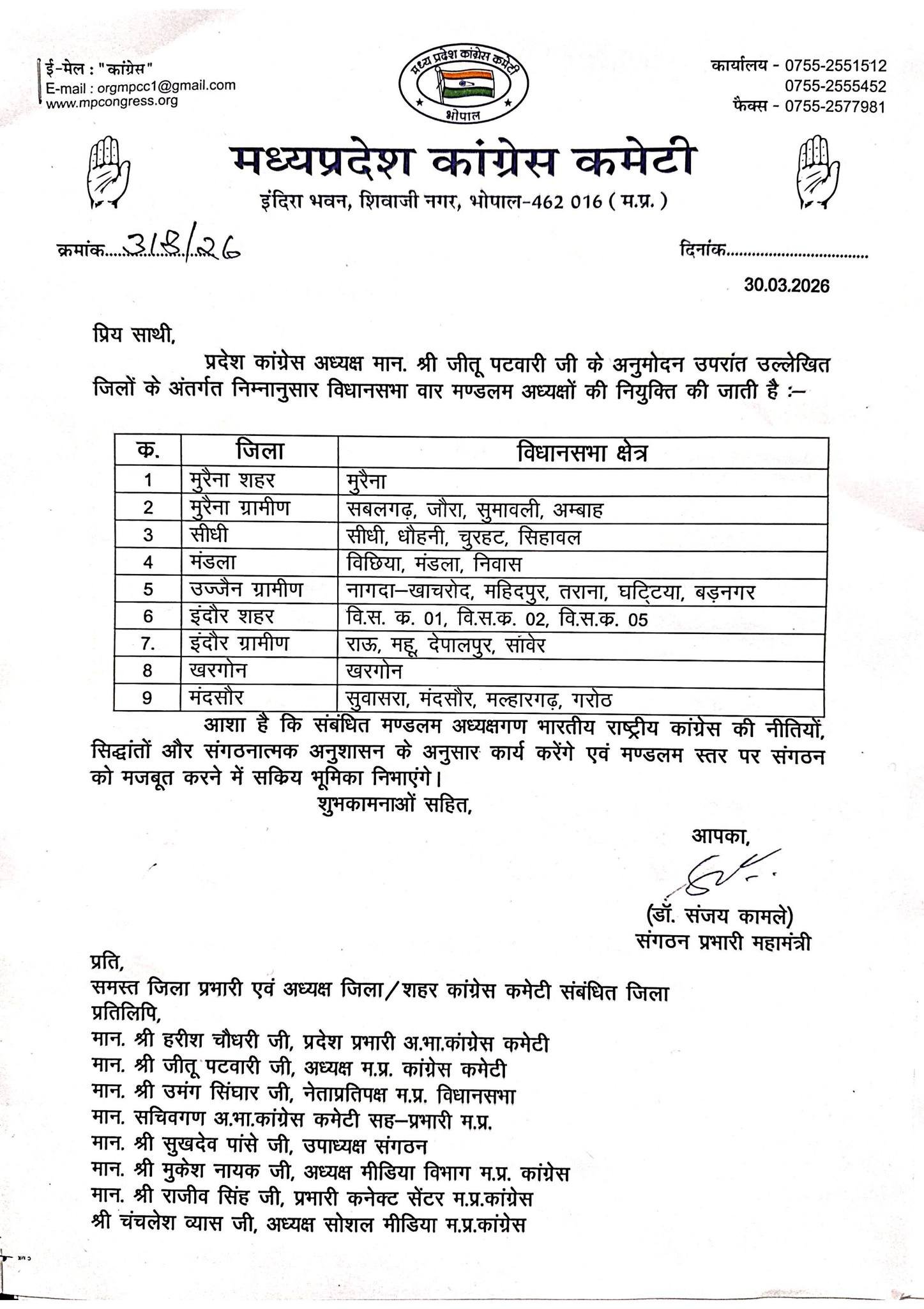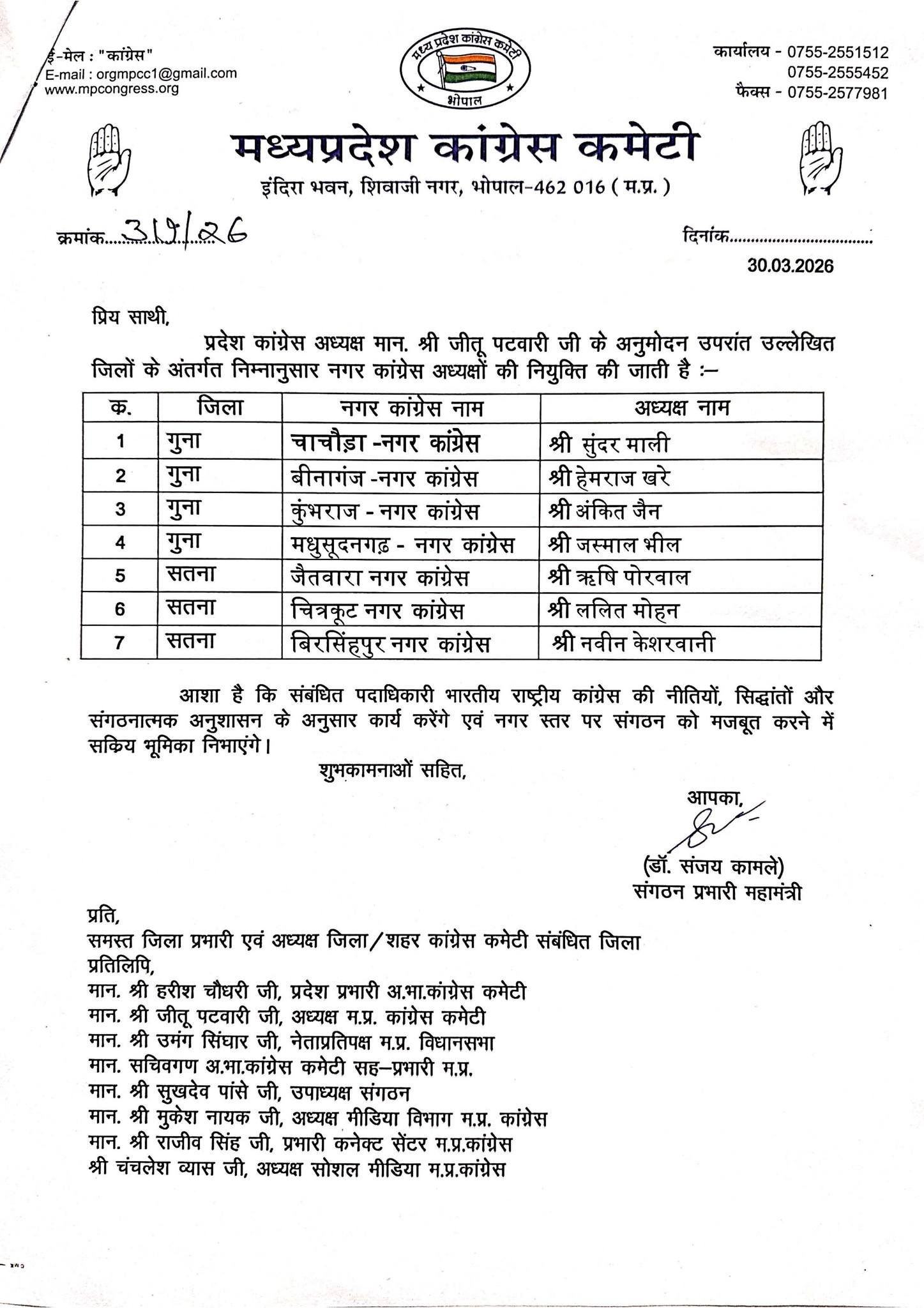 Bhopal नगर कांग्रेस अध्यक्षों एवं मंडलम अध्यक्षों की नियुक्ति scnnewsindia.com March 30, 2026 Scn News India ब्यूरो रिपोर्ट प्रदेश कांग्रेस अध्यक्ष श्री जीतू पटवारी जी के निर्देशानुसार निम्न नगर कांग्रेस अध्यक्षों एवं मंडलम अध्यक्षों की नियुक्ति की गई है। Post navigation Previous: (वीडियो )गायक निराकार सागर एवं गायिका दर्शना जैन ने जमाया रंग -गाता रहे मेरा दिल प्रतियोगिता में जीता प्रथम पुरूस्कारNext: 16 साल की छात्रा 17 साल के लड़के से इश्क कर बैठी ,लड़के ने शादी से किया मना तो 70 फीट ऊंचे टॉवर पर चढ़ गई (वीडियो ) Related News Bhopal शिवराज सिंह चौहान ने प्राची को यूपीएससी की परीक्षा में उत्तीर्ण करने पर किया सम्मानित (वीडियो ) scnnewsindia.com March 30, 2026 Bhopal दो दिवसीय युवा विधायक सम्मेलन आज से scnnewsindia.com March 30, 2026 Bhopal राजधानी में फिर एक सहेली ने नाबालिक को शराब पिलाई, दो दोस्तों ने किया रेप -चार गिरफ्तार scnnewsindia.com March 30, 2026