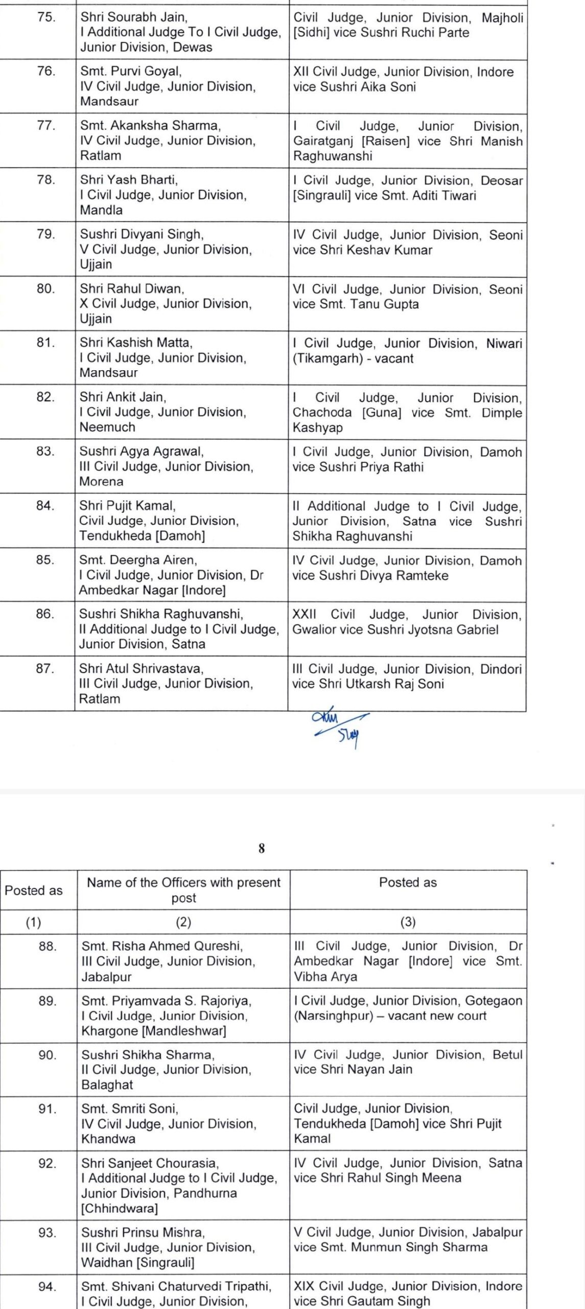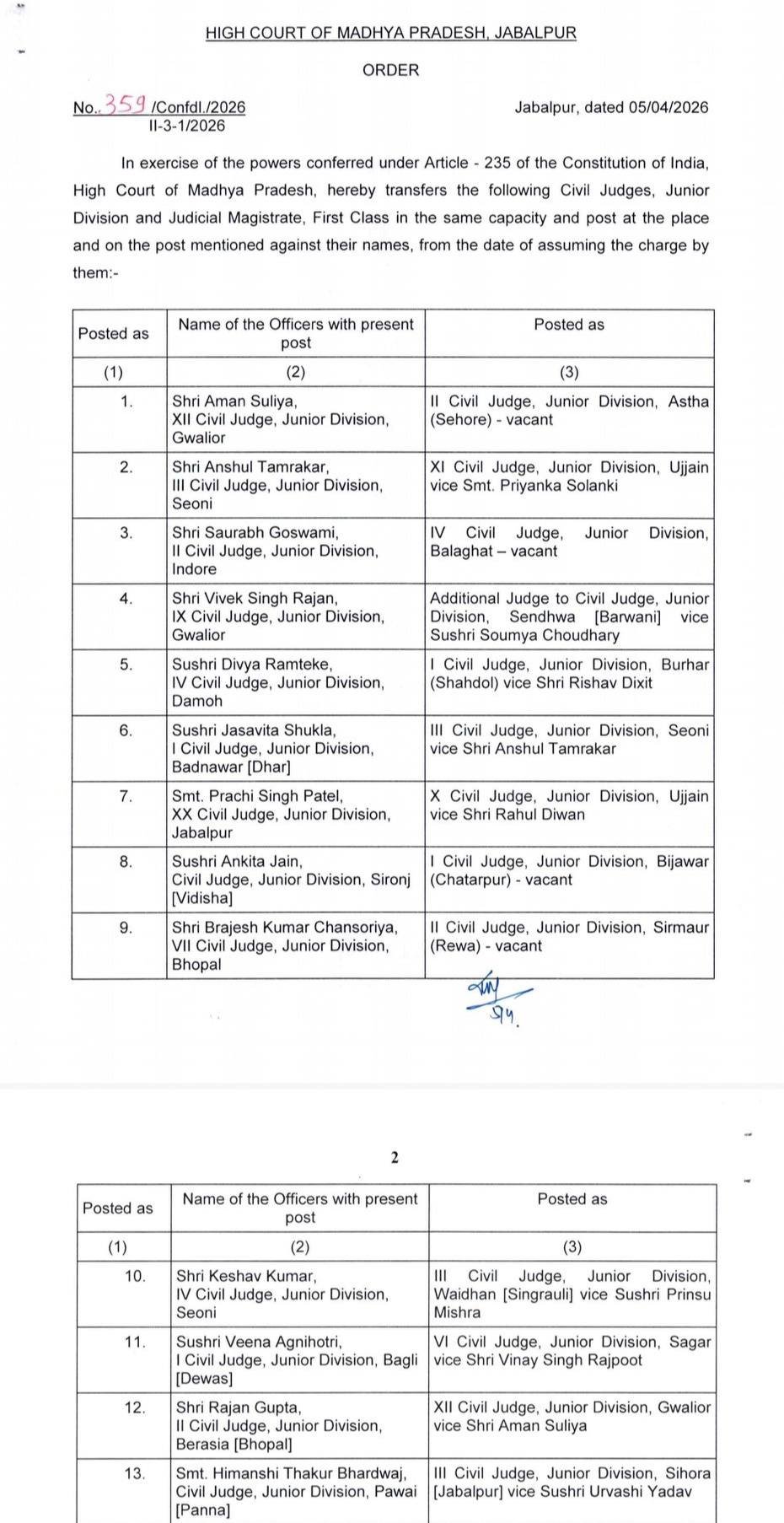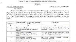 scn news india मध्य प्रदेश में 191 सिविल जजों के तबादले, बड़ा फेरबदल scnnewsindia.com April 6, 2026 Scn News Indiaब्यूरो रिपोर्ट मध्य प्रदेश में 191 सिविल जजों के तबादले न्यायिक क्षेत्र में बड़ा फेरबदल Post navigationPrevious: मध्य प्रदेश नगर पालिका निगम कर्मचारी महासंघ का प्रदेश कार्य समिति बैठक का हुआ सफल आयोजनNext: प्रभावित किसानों की हर संभव मदद की जाएगी : संभागायुक्त श्री तिवारी Related News scn news india मध्य प्रदेश नगर पालिका निगम कर्मचारी महासंघ का प्रदेश कार्य समिति बैठक का हुआ सफल आयोजन scnnewsindia.com April 6, 2026 scn news india बिल्डिंग के कमान बाथरूम के वीडियो और फोटो आने लगे बाहर, सफाईकर्मी निकला मास्टरमाइंड,अब सलाखों के पीछे scnnewsindia.com April 6, 2026 scn news india गए थे ब्लेकमेलिंग की शिकायत करने,पुलिस ने आरोपियों को पकड़ा तो जप्त लेपटॉप में शिकायतकर्ता के ही 121 यौनशोषण के वीडियो मिले -गिरफ्तार scnnewsindia.com April 6, 2026