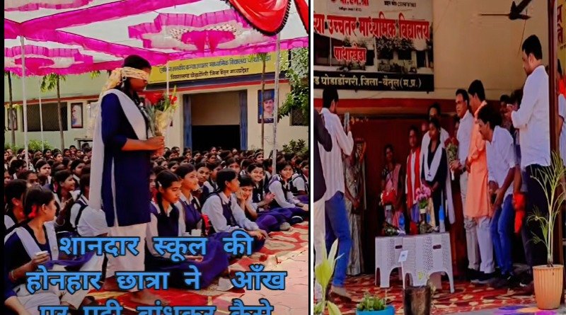 ऐसा स्वागत शायद ही और कंही देखने को मिला होगा की एक स्कूली बालिका हाथों में गुलदस्ता और आँखों पर पट्टी बाँध मंच के नीचे बैठी अन्य छात्राओं के पांच से ढोलक की थाप पर अंदाजा लगाते हुए पहले धीर धीर मंच तक पहुँचती है। फिर सीढ़ियों पर चढ़ती है। और उसके बाद मंच पर बैठे मुख्य अतिथि विधायक डॉ योगेश पंडाग्रे का फूलों का गुलदस्ता भेंट कर स्वागत करती है । देखें वीडियो –