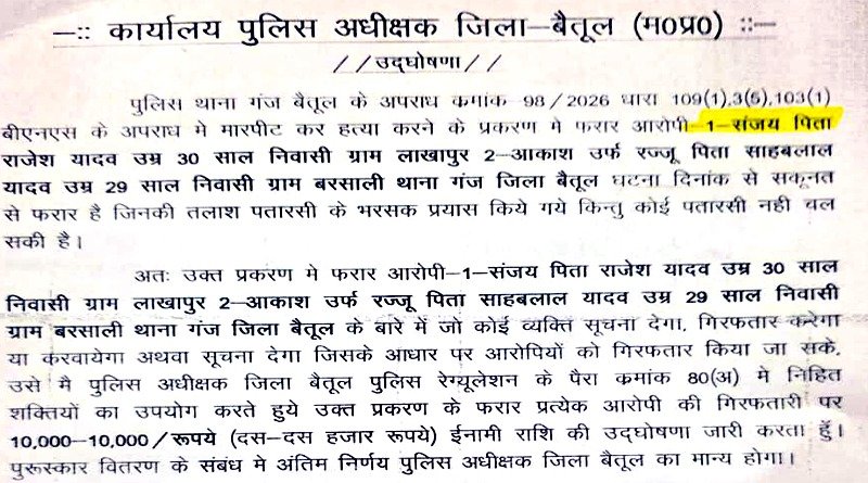 पुलिस अधीक्षक ने फरार आरोपी-1- संजय पिता राजेश यादव उम्र 30 साल निवासी ग्राम लाखापुर 2- आकाश उर्फ रज्जू पिता साहबलाल यादव उम्र 29 साल निवासी ग्राम बरसाली थाना गंज जिला बैतूल की सूचना देने वाले को 10,000-10,000/ रूपये (दस-दस हजार रूपये) ईनामी राशि की उद्घोषणा की है।