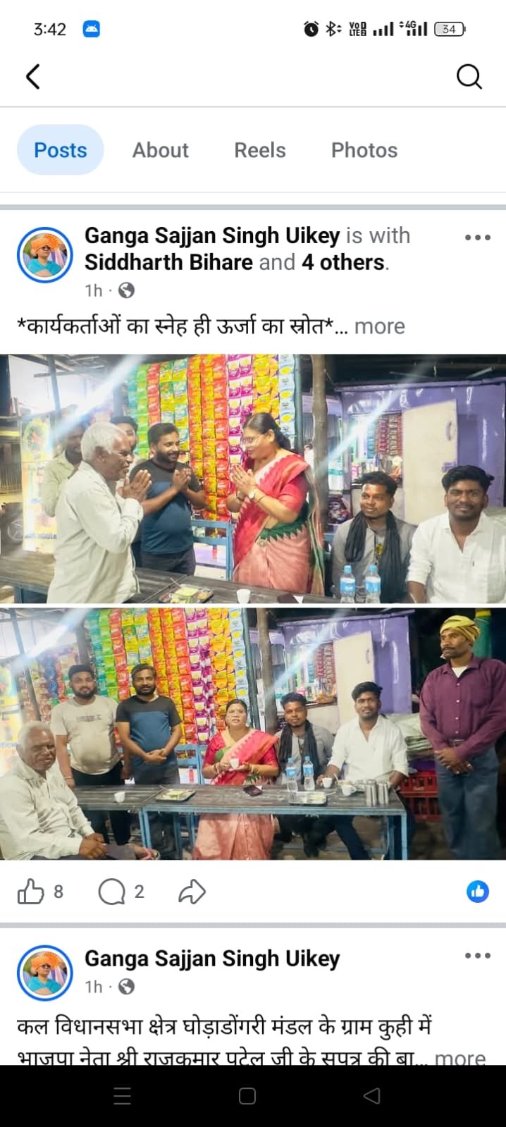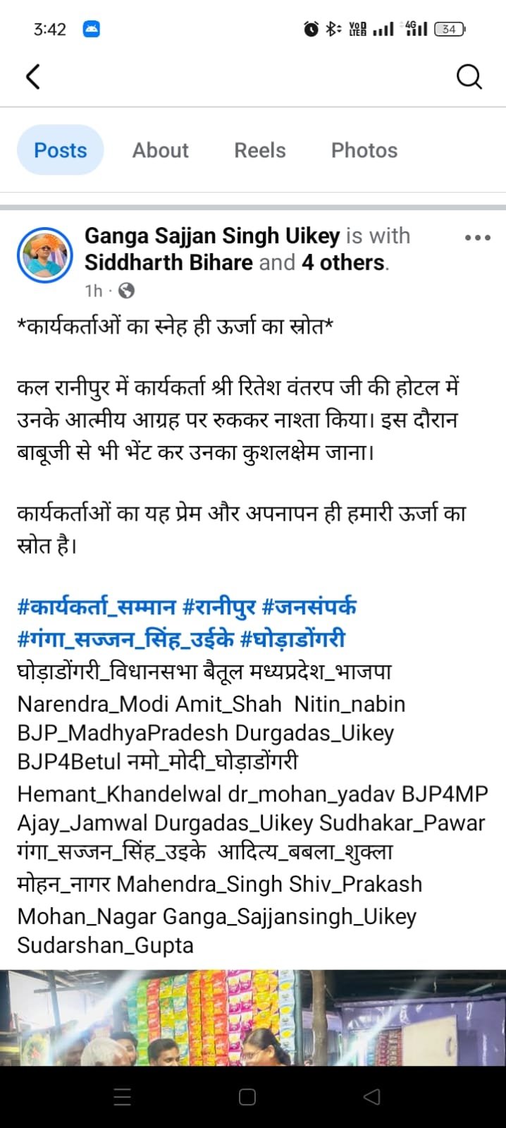 जिसका जिक्र स्वयं विधायक श्रीमती गंगा सज्जन सिंह उईके ने अपने सोशल मीडिया पेज पर साँझा किया है। उन्होंने FB पर पोस्ट करते हुए लिखा है की “कार्यकर्ता का स्नेह ही ऊर्जा का श्रोत है। कल रानीपुर में कार्यकर्ता श्री रितेश वंत्रप जी के होटल पर उनके आत्मीय आग्रह पर रूककर नाश्ता किया। इस दौरान बाबूजी से भेंट की और कुशलक्षेम जानी। कार्यकर्ताओ का यह प्रेम और अपनापन ही हमारी ऊर्जा है।”