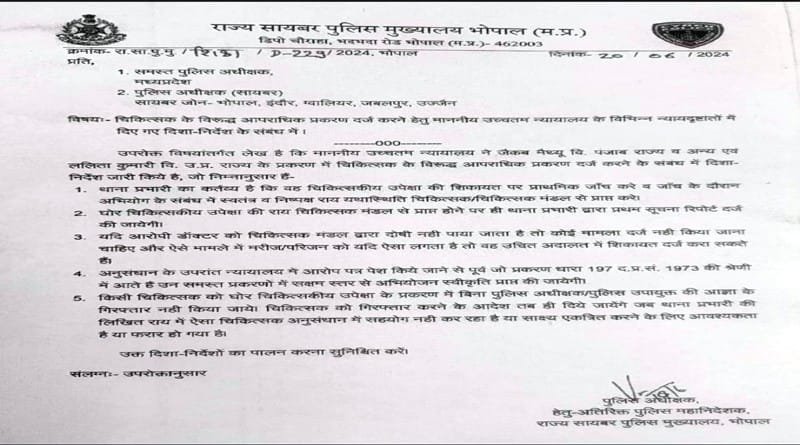 राज्य साइबर पुलिस मुख्यालय भोपाल द्वारा समस्त जिले के पुलिस अधीक्षकों चिकित्सकों के विरुद्ध शिकायतों पर आपराधिक प्रकरण दर्ज करने हेतु न्यायालय के आदेशानुसार दिशा निर्देश जारी किये गए है। जिनमे शिकायत से ले कर गिरफ्तारी तक नियम दर्शाये गए है। अब तक शासकीय अस्पतालों में विभिन्न गड़बड़ियों और इलाज में कोताही की शिकायतों पर पुलिस एफआईआर दर्ज करने में कोताही बरतती थी। लेकिन अब राज्य शासन द्वारा इन मामलो में संज्ञान लिया गया है। और न्यायालय के दिशा निर्देश अनुसार अब मेडिकल बोर्ड की अनुशंसा उपरांत चिकित्सको पर भी पुलिस निष्पक्षता के साथ कारवाही कर सकेगी।