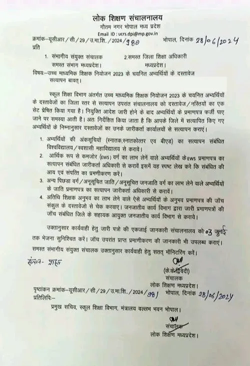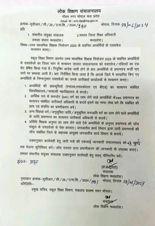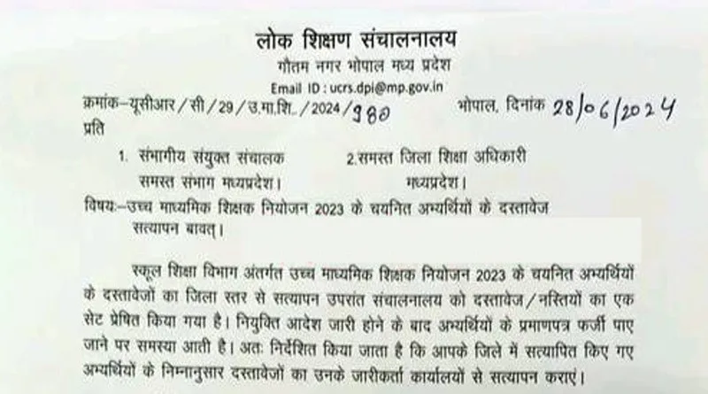 लोक शिक्षण मध्य प्रदेश के संचालक श्री केके द्विवेदी ने समस्त संभागीय संयुक्त संचालक एवं जिला शिक्षा अधिकारी के नाम जारी पत्र क्रमांक-यूसीआर/सी/29/उ.मा.शि./2024/980 दिनांक 28 जून 2024 में लिखा है कि, स्कूल शिक्षा विभाग अंतर्गत उच्च माध्यमिक शिक्षक नियोजन 2023 के चयनित अभ्यर्थियों के दस्तावेजों का जिला स्तर से सत्यापन उपरांत संचालनालय को दस्तावेज/नस्तियों का एक सेट प्रेषित किया गया है। नियुक्ति आदेश जारी होने के बाद अभ्यर्थियों के प्रमाणपत्र फर्जी पाए जाने पर समस्या आती है। अतः निर्देशित किया जाता है कि आपके जिले में सत्यापित किए गए अभ्यर्थियों के निम्नानुसार दस्तावेजों का उनके जारीकर्ता कार्यालयों से सत्यापन कराएं।