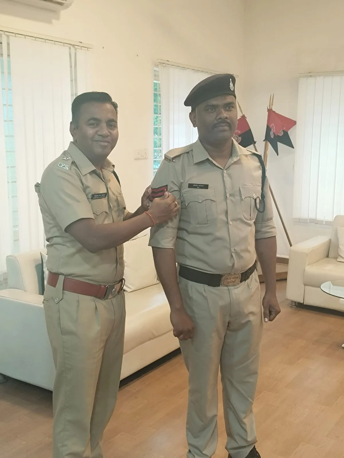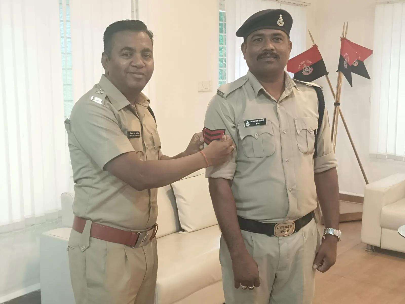 बैतूल,आरक्षक से प्रधान आरक्षक के पद पर कार्यवाहक प्रभार दिए जाने हेतु प्रकाशित उपयुक्तता सूची के आधार पर आज दिनांक 17 जुलाई 2024 को श्रीमान पुलिस अधीक्षक महोदय के द्वारा आरक्षक क्रमांक 635 अजाब राव पंडोल एवं आरक्षक क्रमांक 94 अभिजीत कुमार खलतकर को आरक्षक से प्रधान आरक्षक के उच्च पद का कार्यवाहक प्रभार प्रदाय किया गया।
