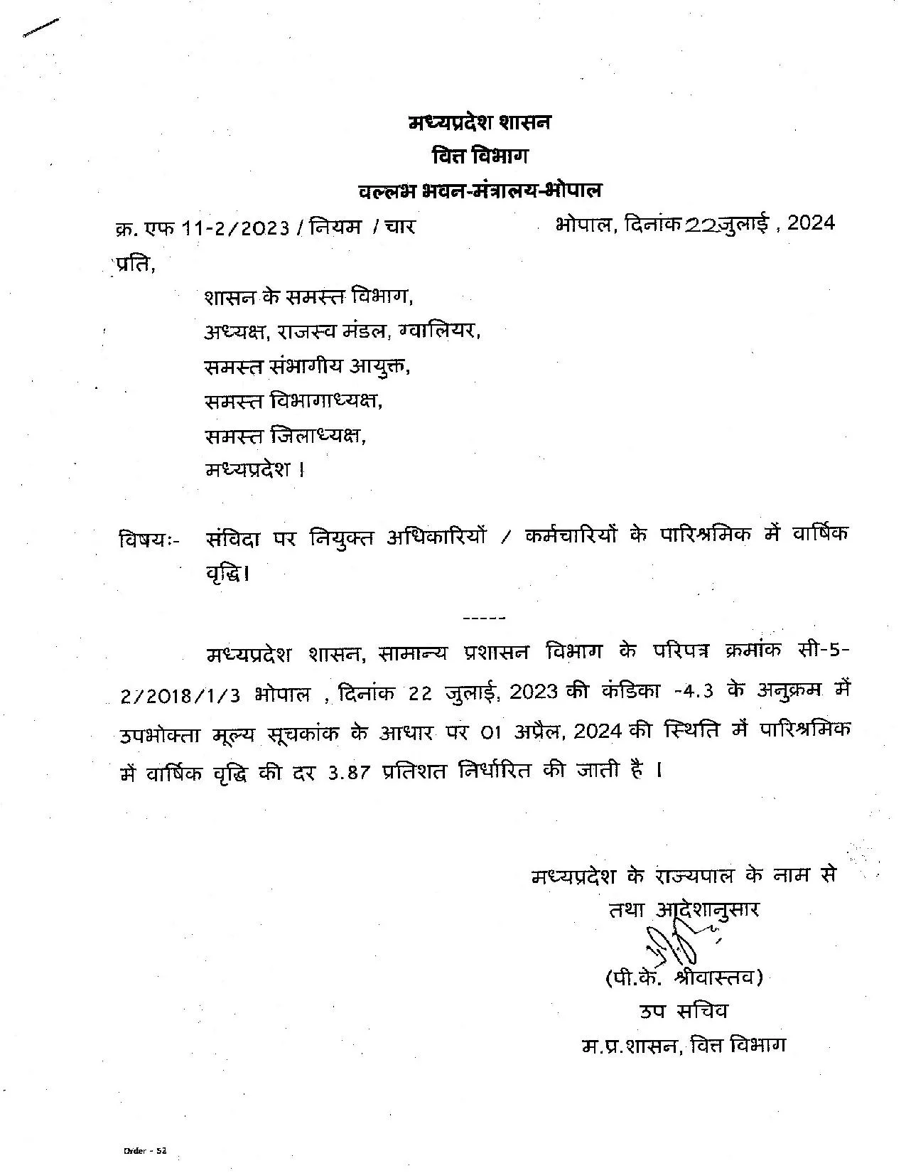 राज्य शासन ने संविदा पर नियुक्त अधिकारी/कर्मचारियों के 1 अप्रैल, 2024 की स्थिति में पारिश्रमिक में वार्षिक वृद्धि की दर 3.87 प्रतिशत निर्धारित की गई है।