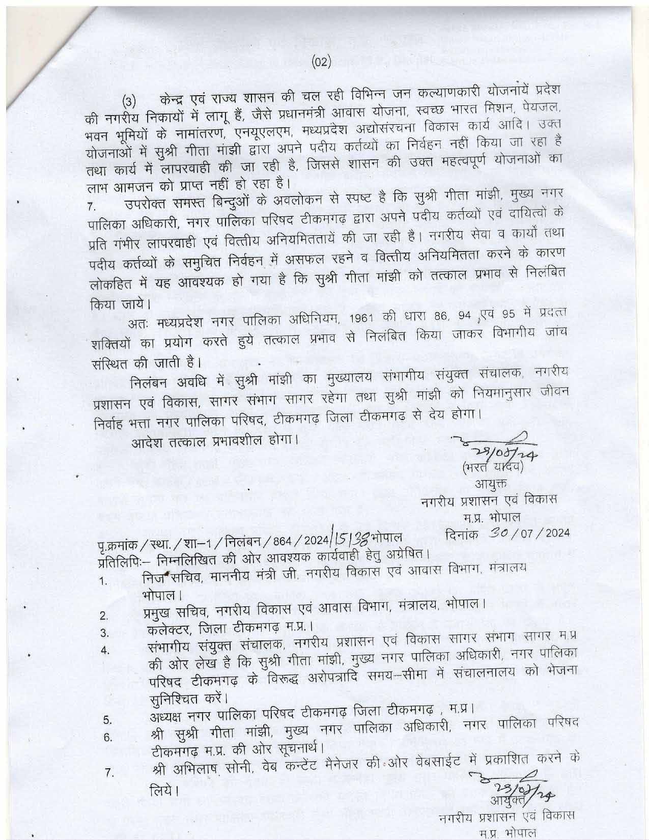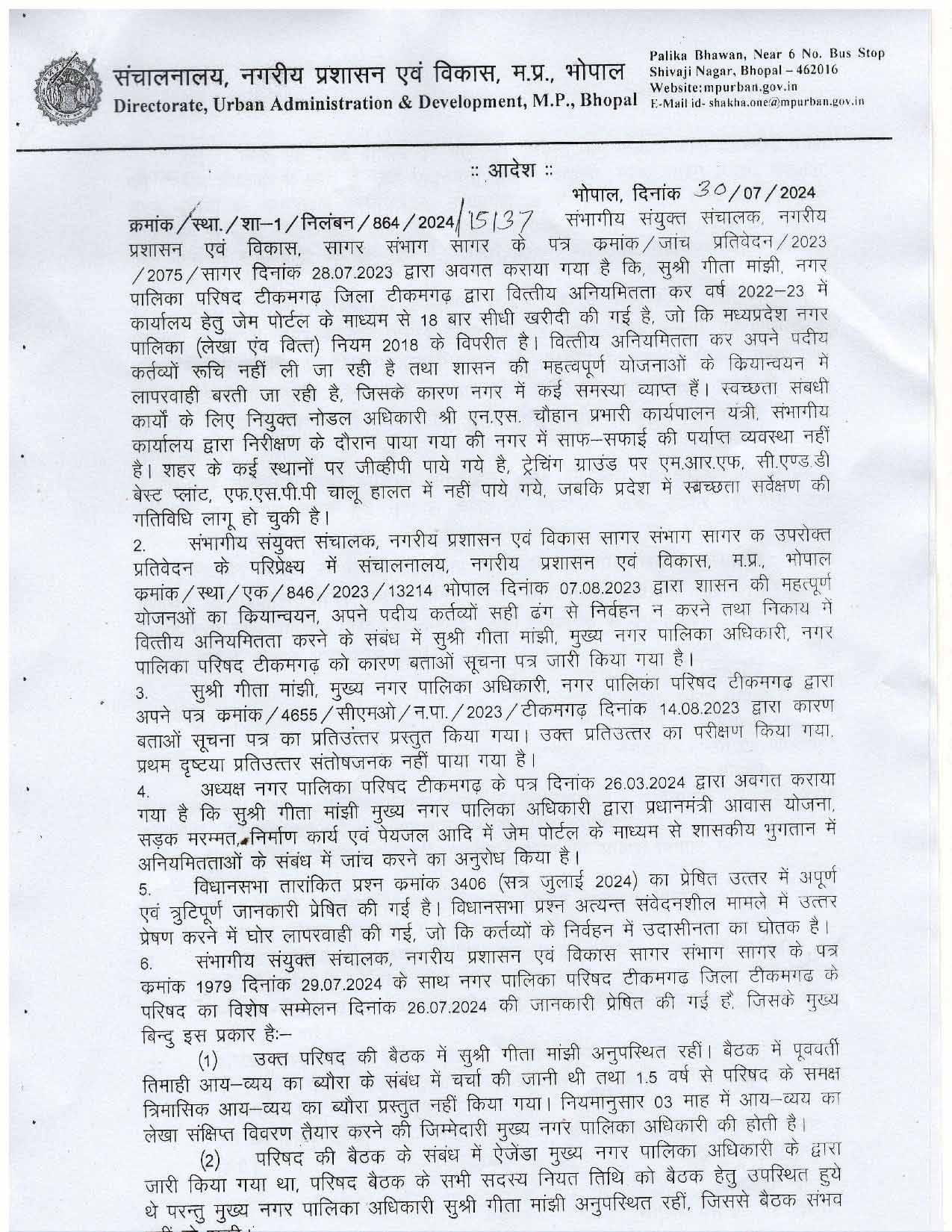 टीकमगढ़ नगर पालिका सीएमओ गीता मांझी को उनके खिलाफ वित्तीय अनियमितताओं और काम में लापरवाही बरतने के आरोप में निलंबित कर दिया गया  हैं। मंगलवार को नगरीय प्रशासन आयुक्त भारत यादव ने उनको निलंबित करने का पत्र जारी किया है।