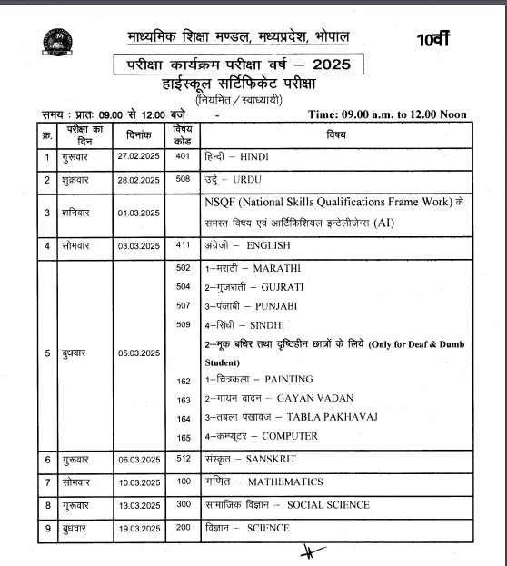 माध्यमिक शिक्षा मंडल एमपी बोर्ड ने की 10वीं 12वीं की परीक्षा का टाइम टेबल जारी किया है। परीक्षा अगले वर्ष 25 फरवरी से शुरू होंगी। जिसमे  18 लाख से अधिक परीक्षार्थी दोनों परीक्षा में शामिल होंगे।