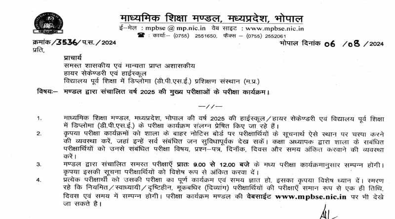 एमपी बोर्ड ने की 10वीं 12वीं की परीक्षा का टाइम टेबल जारी-परीक्षा अगले वर्ष 25 फरवरी से होंगी शुरू