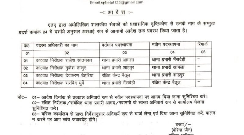 Read Moreब्यूरो रिपोर्ट बैतूल पुलिस अधीक्षक वीरेन्द्र जैन ने पुलिस विभाग में 4थानों के प्रभारी बदलने के आदेश जारी किए है